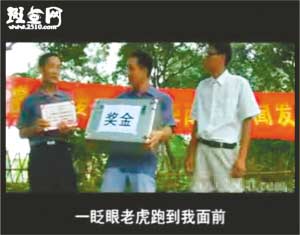 事隔4個多月后,近日“周老虎”還原真相成了紙老虎。隨后記者在斑點網(wǎng)等視頻網(wǎng)站上看到,從6月30日開始,全長27分47秒的視頻小電影《拍虎》也被傳到網(wǎng)上,片中周正龍被稱為“周震聾”,因為林業(yè)局張局長承諾“如果當(dāng)?shù)卮迕裨谖覀兛疾礻犨M山之前能發(fā)現(xiàn)華南虎,我們會給一箱錢作為獎勵”,于是“周震聾”十分興奮,上山尋虎十幾天,最后與人密謀通過年畫拍出華南虎照片。全片最后表現(xiàn)“周震聾”在事情敗露后,從山崖摔下導(dǎo)致失憶,人也變得瘋瘋癲癲,成天抱著個假老虎模型唉聲嘆氣。