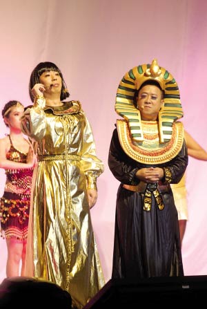 最近的流行大片海報也慘被“惡搞”,包括《赤壁》、《色,戒》等都被改頭換面,《赤壁》成了《破壁》,《見龍卸甲》變成《見紅腳甲》。曾志偉與林敏聰還換了多個搞怪造型登臺,其中以埃及法老、妖后的造型最為出位。本報記者 陳明輝 攝影 阿文