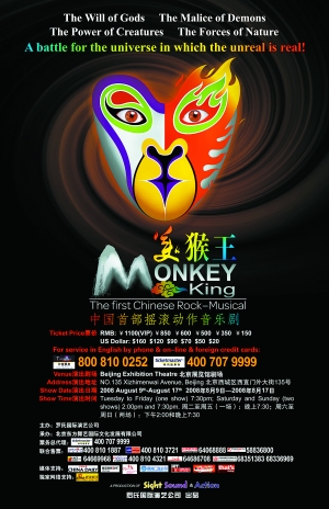 定位為搖滾動作音樂劇,又要與中國傳統(tǒng)音樂元素相結(jié)合,羅啟仁說到音樂上的特點(diǎn)很興奮:“《美猴王》的音樂創(chuàng)作者周佼佼很年輕,作為奧運(yùn)會期間首演的大劇用一位學(xué)生級的作曲,很多人不能認(rèn)同。我不認(rèn)為年輕不行,我有我的勇氣。因?yàn)閾u滾是年輕人的范圍,如果找一位很大年紀(jì)的人來弄搖滾,是‘搖’不出來的。音樂是中國類型的搖滾,是特別新鮮的,西方都沒有這類的作品。吉他和琵琶的二重奏、與古箏的二重奏等,還有美聲的唱法,大概十首歌,聽起來很不錯。”