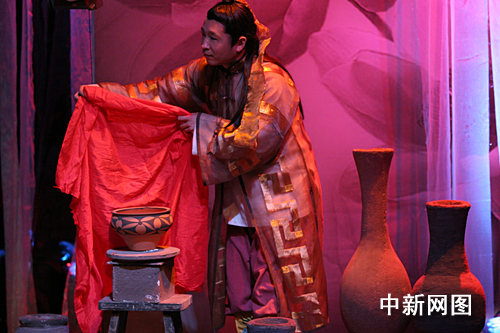 該劇是以發(fā)生在澠池仰韶村一個(gè)陶藝世家的制陶故事為背景,通過秦王的兒子邂逅彩陶女所產(chǎn)生的愛情故事為主線,整個(gè)劇情起伏跌宕,臺詞風(fēng)趣幽默,令觀眾沉醉在悲喜交加的人物命運(yùn)中。影視戲劇演員張成曉勇的精彩演繹博得了全場觀眾的陣陣掌聲和喝彩。當(dāng)絢麗的舞臺燈光變幻出滿場旋轉(zhuǎn)的來自澠池縣仰韶村彩陶坊的精美彩陶時(shí),把整個(gè)劇情推向了高潮,令在場的首都觀眾驚嘆不已。樸拙俊美的仰韶彩陶的確是在金黃的季節(jié)里給首都的觀眾上了一道視覺文化大餐。