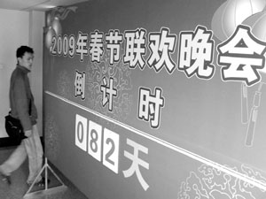 昨日記者前往位于五棵松附近的09春晚劇組,看到劇組門口已經(jīng)掛出了寫有“2009年春節(jié)聯(lián)歡晚會倒計(jì)時(shí)82天”字樣的牌子。每個(gè)進(jìn)入春晚劇組辦公室的人員,每天都必定會經(jīng)過這塊倒計(jì)時(shí)牌。