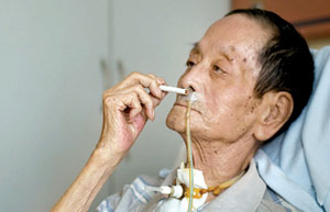 因?yàn)殚L(zhǎng)期抽煙,范老的肺不是很好。住院以后,由于長(zhǎng)期不活動(dòng),抵抗力下降,肺部受到感染。今年2月份,醫(yī)院為范老實(shí)施了氣管切開(kāi)術(shù)。