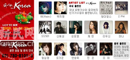 新民網(wǎng)記者從《同一首歌in korea》的官方網(wǎng)站了解到,此次參加該晚會(huì)的名單分“韓國演出者”與“中國演出者”。韓方派出申慧星、Rain、蔡妍等藝人,中方參加的包括趙薇、陳坤、言承旭、王心凌等人。