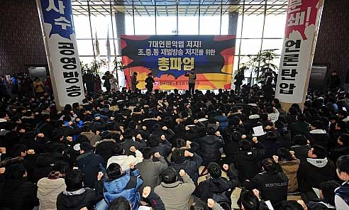 12月26日,MBC電視臺開始加入總罷工的行列。繼新聞節(jié)目《News Desk》主播樸惠珍罷工之后,主持人文智愛和孫正恩也相繼加入罷工行列。據(jù)悉,此次罷工的起因是韓國媒體工會為了反對韓國執(zhí)政黨大國家黨正在推進的媒體相關(guān)法案修正案。