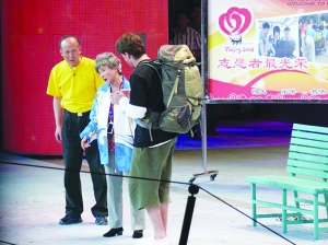 情節(jié):北京奧運會期間,蔡明十分羨慕志愿者。她遇見了穿著志愿者服的郭達(dá),于是纏著他,要跟他一起幫助來北京的客人。兩人遇見了急著找?guī)捻n國小伙子,因為聽不懂小伙子說啥,折騰了半天才明白過來,直把小伙子急得捂著小腹,滿地亂跳。接著兩人遇見了迷路的美國小伙子。美國小伙子只會說簡單的中文,郭達(dá)只會說Welcome to beijing這么一句外語,于是又是一陣瞎鬧騰。蔡明指手畫腳,希望用肢體語言讓小伙子明白各種地名,但越搞越亂。此時,真正的志愿者上場,原來郭達(dá)只是穿了人家晾在外面的志愿者服。蔡明、郭達(dá)失落之時,遇見走失了新郎的新娘,兩人想盡辦法幫她找到了新郎,十分高興,最后大家邊為觀眾發(fā)喜糖邊退場,喜氣十足。