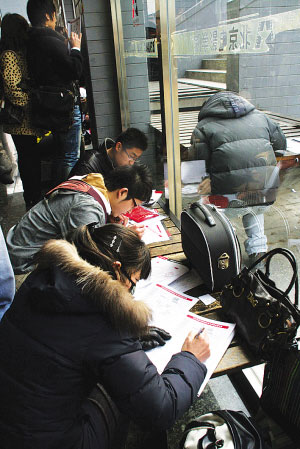 “這張表格千萬(wàn)小心不能填錯(cuò)了!眮(lái)自河北邢臺(tái)的吳丹提醒同學(xué)喬琪。喬琪胖胖的,個(gè)子不高,她是在兩個(gè)同學(xué)的陪同下赴京報(bào)考電影學(xué)院表演系的。