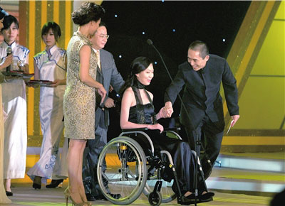 張藝謀、宋祖英為劉巖頒發(fā)“中國年度舞蹈最佳表現女演員獎”。劉巖坐著輪椅緩緩上臺時,張藝謀連忙跑過去幫扶。劉巖哽咽著說:“為了奧運,我們舞者獻出了所有力量,雖然最后我沒能演出,但是依然感到光榮。”