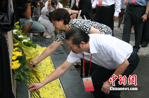 參加祭奠活動(dòng)的有中國(guó)僑聯(lián)常委、部分省市僑聯(lián)領(lǐng)導(dǎo)、為新北川中學(xué)捐資僑胞、新北川中學(xué)建設(shè)者等,他們自發(fā)排成一列在遇難者公墓前獻(xiàn)上菊花,并深深鞠了三個(gè)躬。
