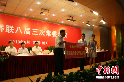 中新網(wǎng)綿陽8月17日電 (南若然)中國僑聯(lián)八屆三次常委會(huì)17日在四川綿陽召開,會(huì)上舉行了愛心企業(yè)和單位向援建北川中學(xué)工程捐贈(zèng)儀式。