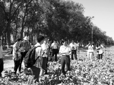 9月4日,參加“文化中國(guó)——海外華文媒體新疆行”的媒體代表到石河子采訪(fǎng)。石河子市外僑辦主任高輿陶(中)向媒體團(tuán)成員介紹當(dāng)?shù)胤N植棉花的情況!拔幕袊(guó)——海外華文媒體新疆行”采訪(fǎng)活動(dòng)由中國(guó)國(guó)務(wù)院僑辦和新疆維吾爾自治區(qū)僑辦主辦,有來(lái)自美國(guó)、加拿大、法國(guó)等23個(gè)國(guó)家和地區(qū)的40家華文報(bào)紙、雜志、電視臺(tái)參加。(張紅攝)