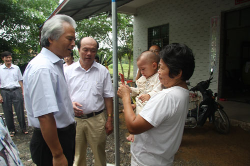 吳士存一行首先赴文昌華僑農(nóng)場(chǎng)進(jìn)行慰問,認(rèn)真聽取了農(nóng)場(chǎng)的災(zāi)情匯報(bào),實(shí)地察看了農(nóng)場(chǎng)農(nóng)作物及魚塘受災(zāi)情況,慰問了生活困難的職工,深入受災(zāi)職工家中與受災(zāi)群眾親切交談,了解職工的實(shí)際困難。所到之處,吳士存關(guān)切的詢問受災(zāi)群眾是否有糧吃、有菜吃、有水喝,今年農(nóng)場(chǎng)農(nóng)作物和魚塘收入受到影響有多大,生活上還有什么困難需要解決。吳士存還和職工們聊起了退水后如何進(jìn)行災(zāi)后重建和開展生產(chǎn)自救工作,并語重心長(zhǎng)的鼓勵(lì)大家要振作精神,艱苦奮斗、同舟共濟(jì)、共度難關(guān)。