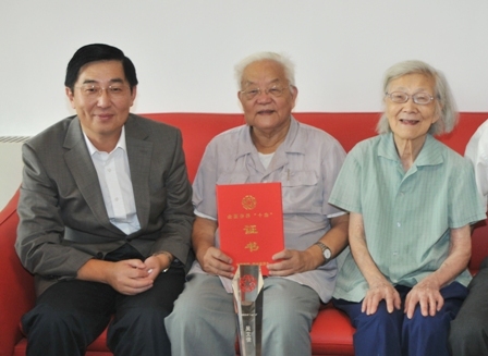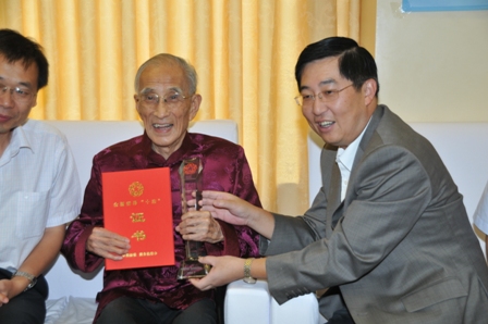 喬衛(wèi)向兩位院士介紹了中國(guó)僑聯(lián)組織及與國(guó)務(wù)院僑辦聯(lián)合開展“全國(guó)僑界十杰”評(píng)獎(jiǎng)的情況,仔細(xì)詢問他們的工作生活和健康狀況。喬衛(wèi)代表中國(guó)僑聯(lián)向吳文俊院士和顏鳴皋院士頒發(fā)了“全國(guó)僑界十杰”獎(jiǎng)杯和證書,并祝愿兩位院士健康長(zhǎng)壽,生活愉快。