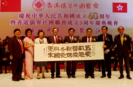 中新網(wǎng)9月29日電 9月24日晚,香港僑界社團聯(lián)會在香港伊利沙白體育館舉辦慶祝中華人民共和國成立60周年暨香港僑界社團聯(lián)會成立5周年慶典,香港特區(qū)行政長官曾蔭權(quán)、中央政府駐港聯(lián)絡(luò)辦主任彭清華、副主任黎桂康、外交部駐港特派員公署特派員呂新華、全國政協(xié)港澳臺僑委員會副主任林兆樞、國務(wù)院僑辦副主任許又聲、中國僑聯(lián)副主席王永樂以及香港各界僑胞近3000人出席了慶典。