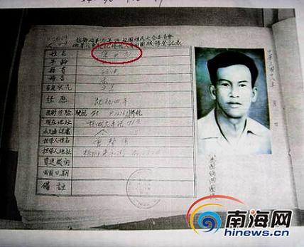 陳良維說(shuō),經(jīng)過(guò)查詢父親檔案,父親原來(lái)在馬來(lái)西亞生活時(shí),名字叫李燕鴻(音),1915年6月出生于馬來(lái)西亞馬六甲,祖籍福建,從祖代起在馬來(lái)西亞馬六甲定居。在他原來(lái)的家族里,父親陳亞九(李燕鴻)共有親兄弟6人,他在家中排行第三,在馬來(lái)西亞的親人上有兩個(gè)大哥、下有3個(gè)弟弟,大哥做工、二哥捕魚(yú)、四弟做橡膠買賣,五弟和六弟當(dāng)司機(jī)。家里有樓房和商鋪,還有其它產(chǎn)業(yè),父親陳亞九出生時(shí)祖父就已去世。原來(lái)的家庭住址為馬來(lái)西亞檳城大車路71B。