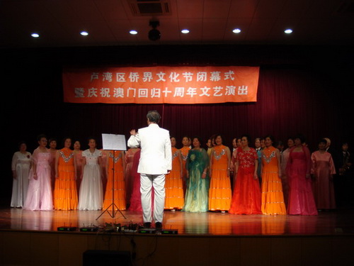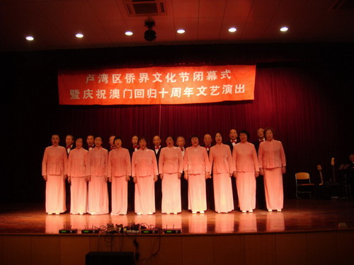 一首優(yōu)美動聽的《七子之歌—澳門》拉開了盧灣區(qū)僑界文化節(jié)閉幕式暨慶祝澳門回歸十周年文藝演出的序幕,來自區(qū)內(nèi)僑界親情中華藝術(shù)團(tuán)、五里社區(qū)、打浦社區(qū)、SUNDAY合唱團(tuán)的各種歌曲、大合唱、時(shí)裝表演、器樂演奏、上海說唱等節(jié)目你方唱罷我登場,充分展示了盧灣區(qū)僑界文化節(jié)活動的豐富多彩,充分展示了盧灣區(qū)僑界群眾的良好風(fēng)貌。