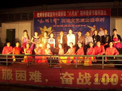 欽州市粵劇團(tuán)共演出舞蹈、小品、獨(dú)唱等20多個節(jié)目,內(nèi)容豐富多彩,謳歌了欽州改革開放成就,有鮮明地方特色。觀看群眾達(dá)到3000多人。