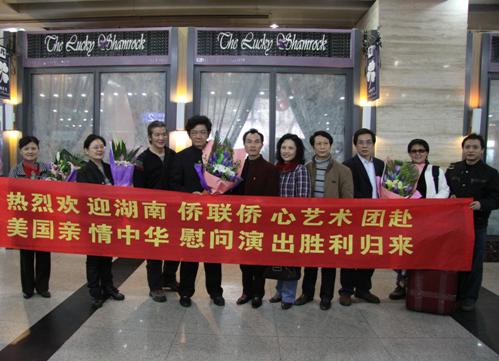 中新網2月11日電 據湖南省僑聯(lián)消息,經湖南省政府批準,由湖南省僑聯(lián)組團,湖南省僑聯(lián)、長沙市外事僑務辦公室、長沙市僑聯(lián)、開福區(qū)僑聯(lián)主辦,應美國有關僑(社)團的邀請,湖南省僑聯(lián)僑心藝術團于2010年1月23至2月8日,在紐約、洛杉磯、華盛頓、休斯敦、圣安東尼奧等城市“親情中華”赴美慰問巡演,圓滿成功,于2月9日載譽平安歸來。