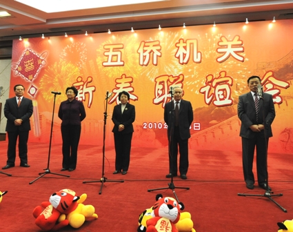 中新網(wǎng)2月12日電 據(jù)中國僑聯(lián)網(wǎng)消息,虎步奔騰開勝景,春風(fēng)浩蕩展鴻圖。2月8日下午,首都大酒店洋溢著節(jié)日的喜慶氣氛。中央“五僑”機關(guān)在這里隆重舉行2010年新春聯(lián)歡會!拔鍍S”機關(guān)干部職工和離退休老干部400多人歡聚一堂,喜迎新春佳節(jié)。