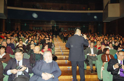 接著,由空軍政治部文工團組成的“親情中華”藝術(shù)團的藝術(shù)家們?yōu)榇蠹冶硌萘司实奈膴使?jié)目,龐妮娜和楊帥表演的舞蹈令觀眾耳目一新,特別是他們所表現(xiàn)出來的扎實的基本功令在場的意大利觀眾驚嘆不已;當(dāng)田毅走上觀眾席,“真朋友”的歌聲在每個人的身邊響起時,懂中文的觀眾向意大利友人傳遞著友情。梁召今獨唱的意大利語民歌“我的太陽”一曲震驚全場,掌聲如雷。