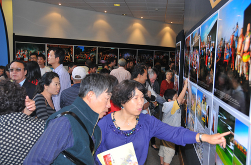 演出前,“文化中國•四海同春”大洋洲藝術(shù)團(tuán)團(tuán)長、國務(wù)院僑辦副主任趙陽在劇場外大廳為《中華民族全家福》圖片展剪彩。一幅幅圖片展示著中國56個民族多姿多彩的文化生活;匠莾S胞們或駐足欣賞,或興奮地向周邊朋友細(xì)說自己在中國的所見所聞。