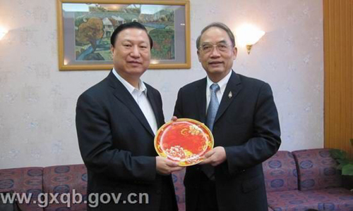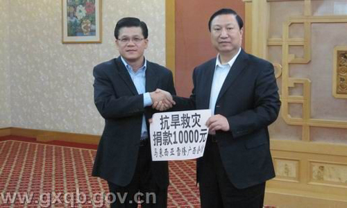 3月26日,馬來(lái)西亞雪隆廣西會(huì)館和泰國(guó)廣西總會(huì)永遠(yuǎn)名譽(yù)會(huì)長(zhǎng)饒培中到訪(fǎng)廣西,馮祖華接待了到訪(fǎng)的客人,向他們通報(bào)了廣西的旱情,馬來(lái)西亞雪隆廣西會(huì)館和泰國(guó)廣西總會(huì)永遠(yuǎn)名譽(yù)會(huì)長(zhǎng)饒培中當(dāng)即分別向廣西災(zāi)區(qū)捐款一萬(wàn)元和一千元。