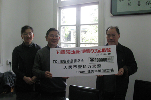中新網(wǎng)4月20日電 據(jù)瑞安市僑聯(lián)消息,青海玉樹縣的地震震撼了每個中國人,也揪緊了千里之外瑞安僑胞的心。4月19日凌晨5時多,浙江省瑞安市寧益鄉(xiāng)僑聯(lián)主席吳勝運接到瑞安籍捷克僑領(lǐng)程志駭?shù)碾娫,說自己有一筆10萬元的玉樹賑災捐款將由他的岳父葉余積轉(zhuǎn)交給瑞安市僑聯(lián)。