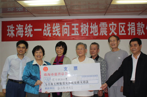 中新網(wǎng)4月22日電 據(jù)珠海外僑局消息,4月20日下午,廣東省珠海市委統(tǒng)戰(zhàn)部在三樓大廳舉行為青海玉樹地震災區(qū)捐款儀式,珠海市新馬泰的僑友在副會長車玉屏、張舉安的帶領下共捐款2800元,為青海玉樹地震災區(qū)獻上珠海特區(qū)僑友的一片愛心。