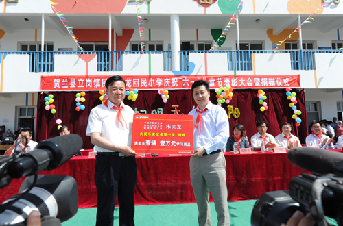 朱奕龍深情地說:和老師同學(xué)們一樣,每一個(gè)“六一”,既是你們最快樂的節(jié)日,也是我最高興、最幸福的日子。因?yàn)?0年前,從銀帝集團(tuán)成立那天起,我就給自己定下了一個(gè)目標(biāo)——每年捐建2所希望小學(xué)。如今,10年過去了,我很榮幸并很負(fù)責(zé)任地向大家報(bào)告,已經(jīng)有60多所奕龍希望小學(xué)扎根全國、全區(qū)各地,我相信不久的將來,還有更多的希望小學(xué)矗立在寧夏山川。2003年,我在黃河岸邊捐建了民樂奕龍小學(xué),吸引了社會(huì)上更多關(guān)注教育、關(guān)注孩子們的眼光,更多的教育資金投向了這里。同時(shí),看到一批批學(xué)生從這里走進(jìn)了更高的學(xué)府,我是多么的高興啊!2008年政治局委員、國務(wù)委員劉延?xùn)|在教育部部長周濟(jì)、自治區(qū)黨委書記陳建國、自治區(qū)人民政府主席王正偉等領(lǐng)導(dǎo)視察了民樂奕龍僑心希望小學(xué),對我也是極大的鼓舞。聽說今年4月,民樂奕龍?jiān)凇皩幭南Mこ?0年”典型表彰活動(dòng)中,又連獲“模范希望小學(xué)”、“希望工程優(yōu)秀教師”、“希望之星”三項(xiàng)提名獎(jiǎng),我為廣大老師和學(xué)校取得的榮譽(yù)感到非常的高興,為你們?nèi)〉玫某煽兏械綗o比的驕傲和自豪。今天看著學(xué)校優(yōu)良的設(shè)施建設(shè),優(yōu)美的教學(xué)環(huán)境,我深感欣慰,更為默默無聞、辛勤工作、無私奉獻(xiàn)的教師們感到敬佩。你們長期為了教育事業(yè)工作在鄉(xiāng)村,對艱苦的生活環(huán)境和生活狀況無怨無悔,令我非常感動(dòng)。