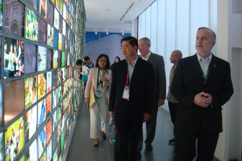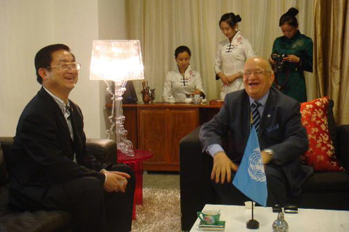 在聯(lián)合國(guó)館項(xiàng)目服務(wù)商、美國(guó)全美蘇浙同鄉(xiāng)總會(huì)會(huì)長(zhǎng)朱元忠的陪同下,崔明華一行又參觀了上海世博會(huì)聯(lián)合國(guó)館,并體驗(yàn)了在聯(lián)合國(guó)館內(nèi)舉行的中國(guó)茶藝表演,并于聯(lián)合國(guó)副秘書長(zhǎng)阿瓦尼·貝南進(jìn)行了親切的會(huì)談。崔明華最后也在留言薄上題詞:“和諧之理念,發(fā)展之動(dòng)力!
