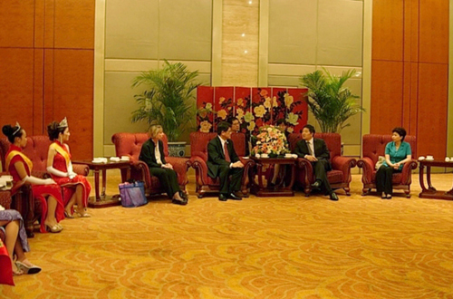 中新網(wǎng)6月23日電 據(jù)國僑辦網(wǎng)站消息,6月17日晚,國務(wù)院僑辦副主任任啟亮在北京新世紀飯店會見并宴請了由夏威夷中華總商會主席劉廣義率領(lǐng)的“第六十一屆水仙花皇后友好訪問團”全體成員。