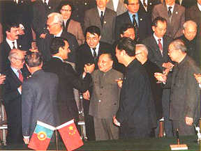 中共中央顧問(wèn)委員會(huì)主任鄧小平與葡萄牙總理席爾瓦共同舉杯,慶賀中葡聯(lián)合聲明的簽署。
