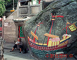 澳門(mén),葡語(yǔ)為"MACAU"。源由之一是,葡萄牙人初到澳門(mén)時(shí),詢(xún)問(wèn)當(dāng)?shù)厝耍藶楹翁??dāng)?shù)厝艘詾槭菃?wèn)背后的媽閣廟,便答:"媽閣"。從此,葡人便以"媽閣"的譯音來(lái)稱(chēng)呼澳門(mén)。(《澳門(mén)繽紛》之"澳門(mén)名稱(chēng)的由來(lái)")