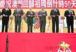 澳門各界三十一日在澳門友誼廣場舉行慶祝澳門回歸倒計(jì)時(shí)五十天活動(dòng),全國政協(xié)副主席、澳門各界慶;貧w活動(dòng)委員會(huì)主席團(tuán)主席馬萬祺(左三)、澳門特別行政區(qū)首任行政長官何厚鏵(左二)、新華社澳門分社社長王啟人(左四)等嘉賓為慶;顒(dòng)剪彩。