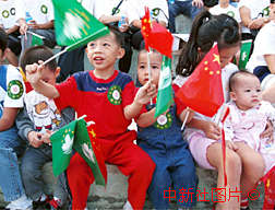 一些澳門兒童在街頭揮舞中華人民共和國國旗與澳門特別行政區(qū)區(qū)旗,慶祝澳門回歸倒計時五十天。