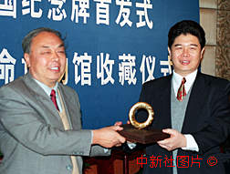 由香港著名設(shè)計(jì)師宣小英設(shè)計(jì)的"澳門回歸紀(jì)念牌",三日在北京由發(fā)行單位中國安徽國際經(jīng)濟(jì)技術(shù)合作公司將"0001"號(hào)捐獻(xiàn)給中國革命博物館作永久收藏。