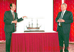 瑞典駐港領(lǐng)事祈榮富先生(右)九日在澳門將一艘十八世紀(jì)商船模型贈送給澳門旅笴娛樂有限公司董事總經(jīng)理何鴻(上焱下木)博士。這艘名為“高登堡”號的商船隸屬瑞典東印度公司,曾於一七三二年至一八零六年三度來華貿(mào)易,并停泊澳門。