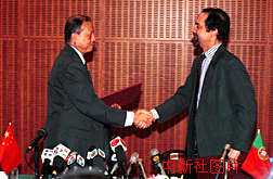 持續(xù)三天的中葡聯(lián)合聯(lián)絡(luò)小組最后一次全體會議(第三十七次會議)十一日在澳門結(jié)束。雙方對聯(lián)絡(luò)小組十二年來進行的工作進行了總結(jié),對聯(lián)絡(luò)小組所取得的成果表示滿意。圖為中方組長韓肇康(左)與葡方組長賈安棟簽署會談紀要。