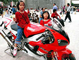 澳門十三日舉行澳門格蘭披士大賽車嘉年華活動,以推廣即將開始的第四十六屆澳門格蘭披士大賽車。一名兒童騎上停放在現(xiàn)場的1000CC格蘭披士電單車"擺甫士"照相。