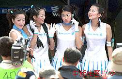第四十六屆澳門格蘭披士賽車場(chǎng)上的賽車宣傳女郎擺"甫士"供人們拍照,成為賽場(chǎng)上的另一風(fēng)景。