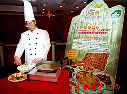 為慶祝澳門(mén)回歸祖國(guó),香港新光酒樓將於十二月一日舉辦盛大的"慶回歸澳門(mén)美食節(jié)",以澳葡菜為主筵開(kāi)六十多席,圖為澳門(mén)木偶餐廳的大廚推介富有特色的"薯絲馬介休"美食。