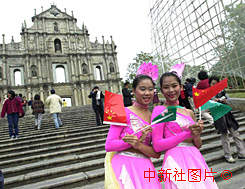 澳門少女裝扮成中國(guó)古代美麗祥和的蓮花仙子形象,在大三巴前參加一個(gè)慶祝澳門回歸的活動(dòng)。中新社傳真