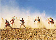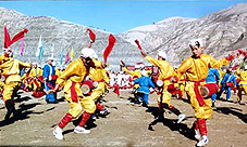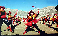 安塞位于陜北高原,那里的腰鼓歷史悠久,格調古樸。人們在歡度節(jié)日,慶祝豐收的時候,都要演出腰鼓助興,每次演出的陣容都很大,一般都有60名左右的鼓手。有時幾個隊連在一起,能拉開一兩里路距離。腰鼓手們的裝束一律著古代將士的便服,或黃或紅包頭,素色衣服,顯得整齊壯觀。電影《黃土地》里的腰鼓手們穿著黑色,想必是為了渲染貧苦背景。實際上,過去上場表演的腰鼓手們,很少有穿皂服的。