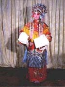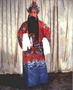 長(zhǎng)袍類 一、蟒:也稱龍袍、蟒袍,是帝、王、將、相在朝賀宴會(huì)或辦公事的時(shí)候所穿的禮服。 蟒的樣式是圓領(lǐng)、大襟、長(zhǎng)度一般拖到腳面,袖子寬闊、肥大,帶水袖,配有寬松的腰帶。 這是戲曲舞臺(tái)上扮演帝王、官員等角色使用量最多的一種蟒袍,扮演文臣武將的老生、小生、武生都可使用。在戲曲舞臺(tái)上,常由蟒袍的色彩來(lái)區(qū)別劇中任的身份、地位與年齡。蟒袍大體分為紅、明黃、杏黃、白、藍(lán)、綠、紫、粉紅、淡湖、淺米、古銅、豆沙、香色等。原箱蟒袍分為上、下五色,上五色是紅、綠、黃、白、黑色;下五色是藍(lán)、紫、粉紅、淡青和香色。明黃與杏黃是扮演皇帝、番王、王子以及齊天大圣(孫悟空)的蟒袍專用色,其他角色不得使用。 蟒的圖案主要是龍形圖案。十團(tuán)龍蟒袍在繡工上大體分為彩繡、墨繡、平金漏地繡、滿金繡、半金半彩繡、裹金繡(一金線、一彩線混合繡)等。繡法各異,色彩紛呈。不同的繡工處理與十團(tuán)龍圖案相配合,使得十團(tuán)龍蟒袍造型莊重、文雅、氣派。 穿用十團(tuán)龍蟒袍的有《甘露寺》中的劉備(因是漢中山靖王劉勝之后,漢景帝之玄孫,過(guò)江招親時(shí),穿紅色十團(tuán)龍袍)、《秦香蓮》中的陳世美(因考中狀元,被招為東床駙馬后,穿十團(tuán)龍紅色蟒袍)、《玉堂春》中的王金龍(因中頭名狀元,并被封為八府巡按,當(dāng)他會(huì)同藩司、臬司三堂會(huì)審舊時(shí)情人蘇三(玉堂春)時(shí),穿十團(tuán)龍紅色蟒袍)。 而平金繡散龍黑色蟒袍則是戲曲舞臺(tái)上扮演花臉行當(dāng)?shù)奈某、武將的官服或朝服。舞臺(tái)上常見(jiàn)的散龍蟒袍有黑、藍(lán)、紫、綠、杏黃等色。 散龍圖案式樣繁多,其造型比團(tuán)龍活潑、豪放。如散坐龍、散升龍、散降龍、倒掛龍、噴水龍、串水龍、串云龍、回頭龍、教子升天龍(一大龍、一小龍)、戲珠升降龍等等,均是散龍大蟒袍常用的圖案。 制作時(shí)以平金繡為主,稍加彩繡為裝飾色,配合騰云飛舞的散龍圖案,及大面積金海水為下擺(海水江芽),其造型格外莊重輝煌。 穿用人物有《秦香蓮》中的包文正(包公)、《霸王別姬》中的項(xiàng)羽(在出征前,除名演員穿黃色蟒袍外,一般都穿黑色散龍大蟒袍)等。 在戲曲舞臺(tái)上扮演地位較高而又到蒼老年齡的文職官員,其穿用的朝服有裹金繡香色蟒袍。因?yàn)閷槔夏旯賳T穿用,所以力求色彩沉穩(wěn),但又不失輝煌效果。制法上采用一線一金的"裹金繡",繡制團(tuán)龍圖案。穿用人物有《甘露寺》中的喬玄、《秦香蓮》中的王延齡等。 而彩繡豆沙色蟒袍則適合舞臺(tái)上扮演地位較高,而又不到蒼老年齡的文職官員穿用。制作時(shí)要求色彩文雅,采用團(tuán)龍圖案,用雅彩裹金繡繡制海水江芽。穿用人物如《將相和》中的藺相如。 彩繡紅色女蟒袍一般為戲曲舞臺(tái)上扮演皇后、貴妃、公主、誥命夫人(受皇帝冊(cè)封的貴婦)及掛帥女將等的朝服和公服。有時(shí)也當(dāng)作世宦人家結(jié)婚時(shí)的禮服。以紅色為主,分為彩繡與平金繡兩種。花紋多用團(tuán)鳳、散鳳和牡丹等,也可龍鳳并用。蟒袍下擺繡有"海水江芽"。女蟒袍有老式和新式兩種式樣。老式女蟒袍,外緣加寬邊;新式女蟒袍形同男蟒袍,不加外邊緣。色彩要求艷麗、輝煌,體現(xiàn)出人物的雍容華貴。 穿用人物有《貴妃醉酒》中的楊玉環(huán)(身著紅色女蟒袍到百花亭侯駕)、《大登殿》中的王寶釧(身穿紅色女蟒袍上朝見(jiàn)君受封為昭陽(yáng)正宮娘娘)。 老旦蟒袍多為戲曲舞臺(tái)上扮演皇太后和地位較高的誥命老夫人穿用的朝服或公服, 穿用人物有《太君辭朝》中的佘太君、《甘露寺》中孫權(quán)之母吳氏。 在戲曲舞臺(tái)上扮演番邦后妃、公主等的朝服,一般稱為女旗蟒袍。以紅色地為主,分彩繡與平金繡兩種,用團(tuán)龍、團(tuán)鳳和龍鳳等圖案。清朝服裝的女旗蟒袍不用"護(hù)領(lǐng)",用湖色硬翻領(lǐng)(類似現(xiàn)代襯衣硬領(lǐng))(領(lǐng)衣),蟒袍下擺海水無(wú)開(kāi)起,旗蟒身長(zhǎng)以不露鞋為標(biāo)準(zhǔn)。 穿用人物有《四郎探母》中的鐵鏡公主(朝見(jiàn)蕭太后穿朝服女旗蟒袍)、《大登殿》中的代戰(zhàn)公主(上殿朝駕時(shí)穿朝服旗蟒)。 蟒中還派生出兩種袍服:一種是官衣,一種是宮衣。 1.官衣:是一般文職官員穿用的禮服。式樣同蟒。圖案是在胸前和背后繡一塊方形的圖案,官衣的色彩有紅、藍(lán)、紫、黑、古銅等。 官衣多為戲曲舞臺(tái)上扮演新科狀元、榜眼、探花等角色臨時(shí)的官服。待任命官職之后再按品級(jí)穿官服。官衣,還可作為七品縣官和新婚典禮中新郎官的吉服。 官衣顏色多為紅色、藍(lán)色、紫色、黑色和白色。黑色官衣品級(jí)最低,多為驛丞(驛站站長(zhǎng))、門官等穿用,不綴補(bǔ)子。白色為國(guó)喪孝服(不常用)。它的造型基本上是明代官服的原樣,只是加以藝術(shù)的美化和提高。 明代官衣不用素地,多用暗紋云錦織成衣料,而舞臺(tái)上大部分用素地(因云錦造價(jià)太高)。 明代官服補(bǔ)子(官員品級(jí)標(biāo)志)多在衣服的前胸、后背部直接繡成,而清代官服品級(jí)標(biāo)志是先繡成補(bǔ)子,然后再綴到天青色褂子上。 穿用人物有《御碑亭》中的王有道和柳生春(在"拜恩師"一場(chǎn