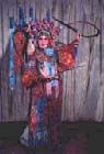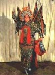 鎧甲類 古代作戰(zhàn)時,戰(zhàn)士穿的鎧甲,在京劇舞臺上叫靠,是一種美化了的舞蹈服裝?渴怯煤蜕乃鼐勛又瞥傻模厦嬗媒、銀彩線繡滿鱗甲,看上去輝煌奪目。 靠分男靠、女靠。 男靠式樣是分前后兩扇披在肩上,還有護領、護肩、下甲、吊魚、靠肚子以及收緊的瘦袖。 女靠上身與男靠形式差不多,下身綴著五色繡花的飄帶,并在靠里襯著裙子,但在開打時,里面也不裙子。 靠一般分硬靠、軟靠和改良靠三種, 穿用人物有《霸王別姬》中的項羽(穿平金黑靠)、《古城會》中的關羽(穿平金綠靠)、《挑滑車》中的岳飛(穿白靠)、高寵(穿藍靠)、《連環(huán)計》中的呂布(穿粉靠)、《破洪州》中的楊宗保(穿淡湖靠)等。 戲曲舞臺上扮演女將、女統(tǒng)帥的戰(zhàn)服多采用女大靠。戲劇中使用的大靠與古代生活中的甲胄并不一樣。隨著戲曲藝術的發(fā)展,大靠的式樣和色彩逐漸增多,但距生活服裝也越來越遠。它純屬為了適應舞臺表演的需要而設計。 建國前女大靠種類較少,只有梅蘭芳演出《穆柯寨》"花廳招親"一場戲穿用"玻璃肚子"(用玻璃棍裝飾的改良靠)。建國后女靠樣式逐漸增多,色彩不斷豐富。戲曲服裝中,女靠比男靠樣式多,而男靠比女靠色彩豐富,女靠只有粉紅、大紅、淡湖等色。新編歷史劇《楊門女將》出臺之后,出現(xiàn)了女白靠、黑靠、雪青靠、米黃靠等。 穿用人物有新編歷史劇《三請樊梨花》中的樊梨花、 軟靠:背后不插靠旗。一般是老年體弱的老將穿用。 改良靠:樣式與軟靠近似,只要腰身既緊又瘦,幾乎就象用腰帶系在身上。有的繡鱗甲,有的繡些花紋或鑲上一些鍍鎳的金屬凸片或看著晶光閃亮象圓釘子形的裝飾。 戲曲舞臺上扮演番將、武將群眾或新編歷史劇中常用改良靠。穿用人物有《雛鳳排空》中的番將韓昌、《三打陶三春》的鄭子明、《鬧龍宮》中的龍子等。 鎧是戲曲舞臺上扮演皇家殿前御林軍、隨駕儀仗隊或軍中統(tǒng)帥的服裝,又稱大鎧。色彩以紅為主,多繡平金幾何圖形紋樣。它的造型與生活中的甲胄相似?梢娝且怨糯罘b為依據(jù)的,只是做法不一。生活服裝有銅釘(有的鍍金)固定在衣服上,而舞臺上的大鎧以平金繡為主。這種穿大鎧的武士在舞臺上只是擺排場,壯聲勢,沒有武打動作。